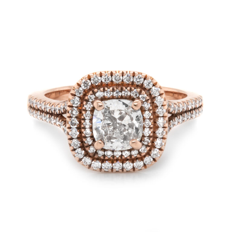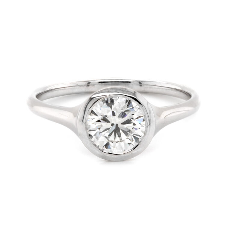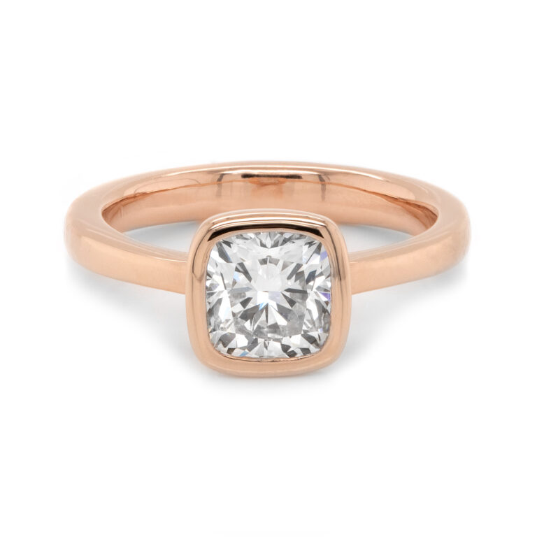 This gorgeous 18KT rose gold engagement ring features a bezel-set,…