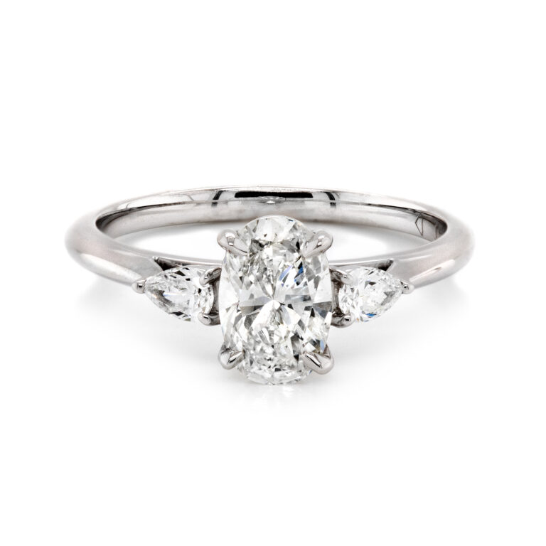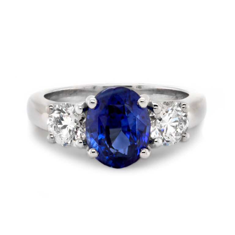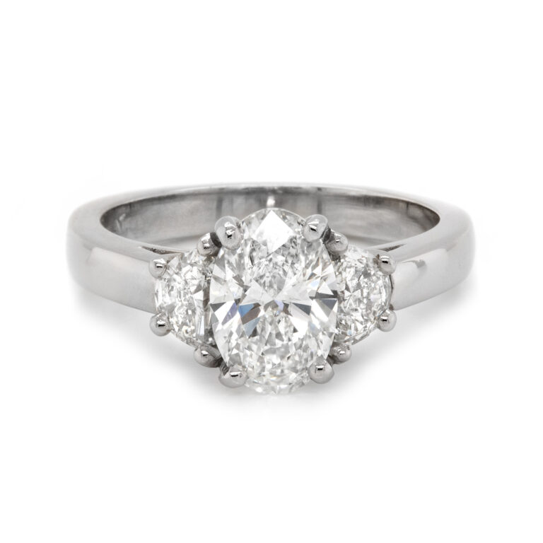 This beautiful three-stone platinum engagement ring features an oval diamond…