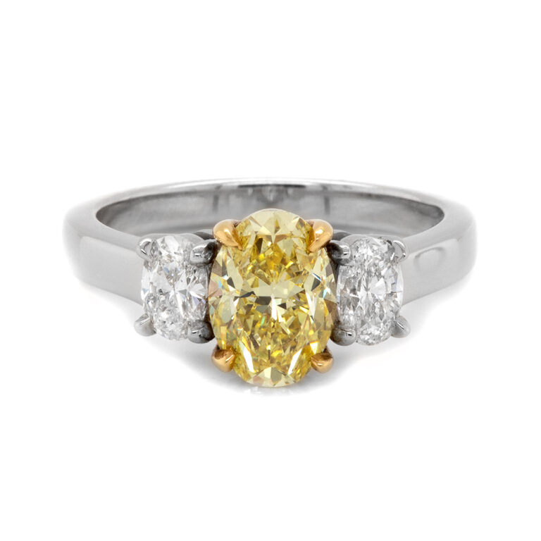 This stunning platinum three-stone ring features a GIA-certified yellow oval…