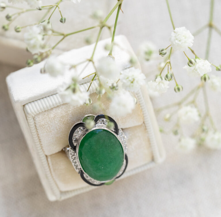 If you think the best of fall is Halloween, this vintage platinum oval jade and diamond ring is the way to celebrate your favorite holiday.