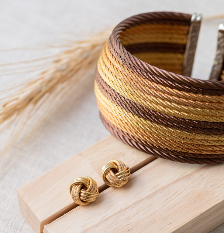 If you’re excited to cuddle up on the couch with a hot cup of apple cider, this golden stud and bracelet duo is perfect for you. These minimalist, yet colorful fall hues will add some elegance to your lounge day.